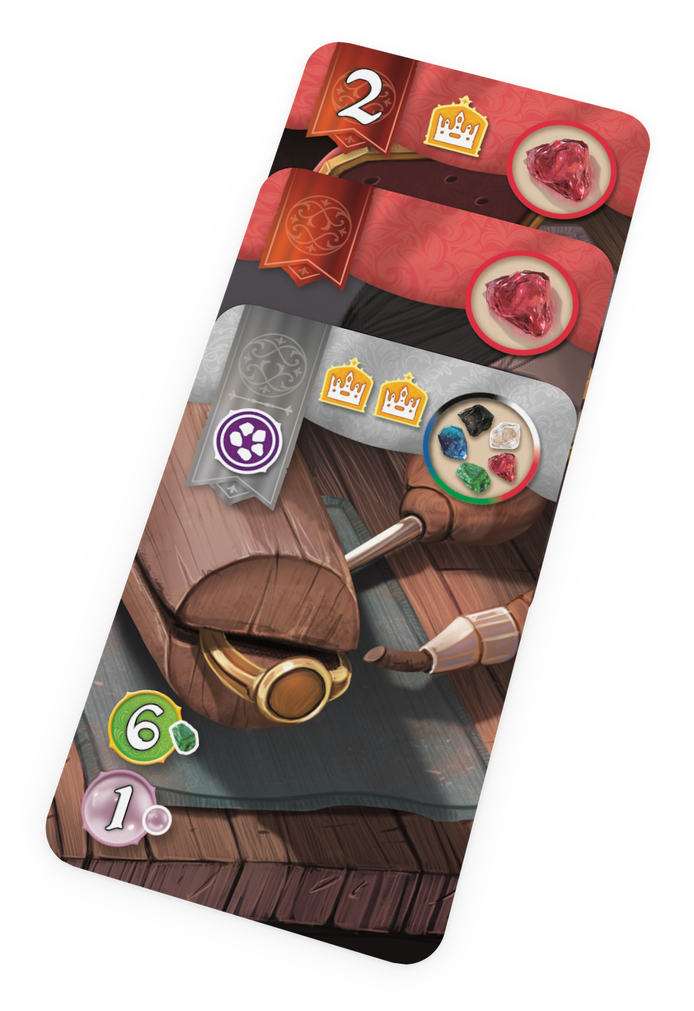 - Karty klejnotów w tej wersji zyskały specjalne umiejętności. Nie tylko produkują dla nas na stałe kryształy w odpowiednim kolorze, ale też zapewniają bonusy takie jak możliwość rozegrania dodatkowej tury, podkradanie przeciwnikowi znaczników czy dodatkowe przywileje.