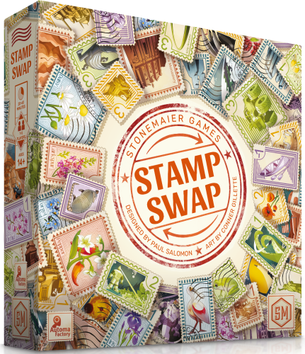 Designer Paul Salomon (Honey Buzz, Genotype) brings stamp collecting to life on tabletops in Stamp Swap! Draft from a public pool of face-down and face-up tiles (along with some bonus cards), then simultaneously divide them into 2 groups. You will select one group from another player and keep the group of yours that isn't selected. Organize your growing collection each round and score 1 of 4 goals--choose wisely, as you can't score that goal again.