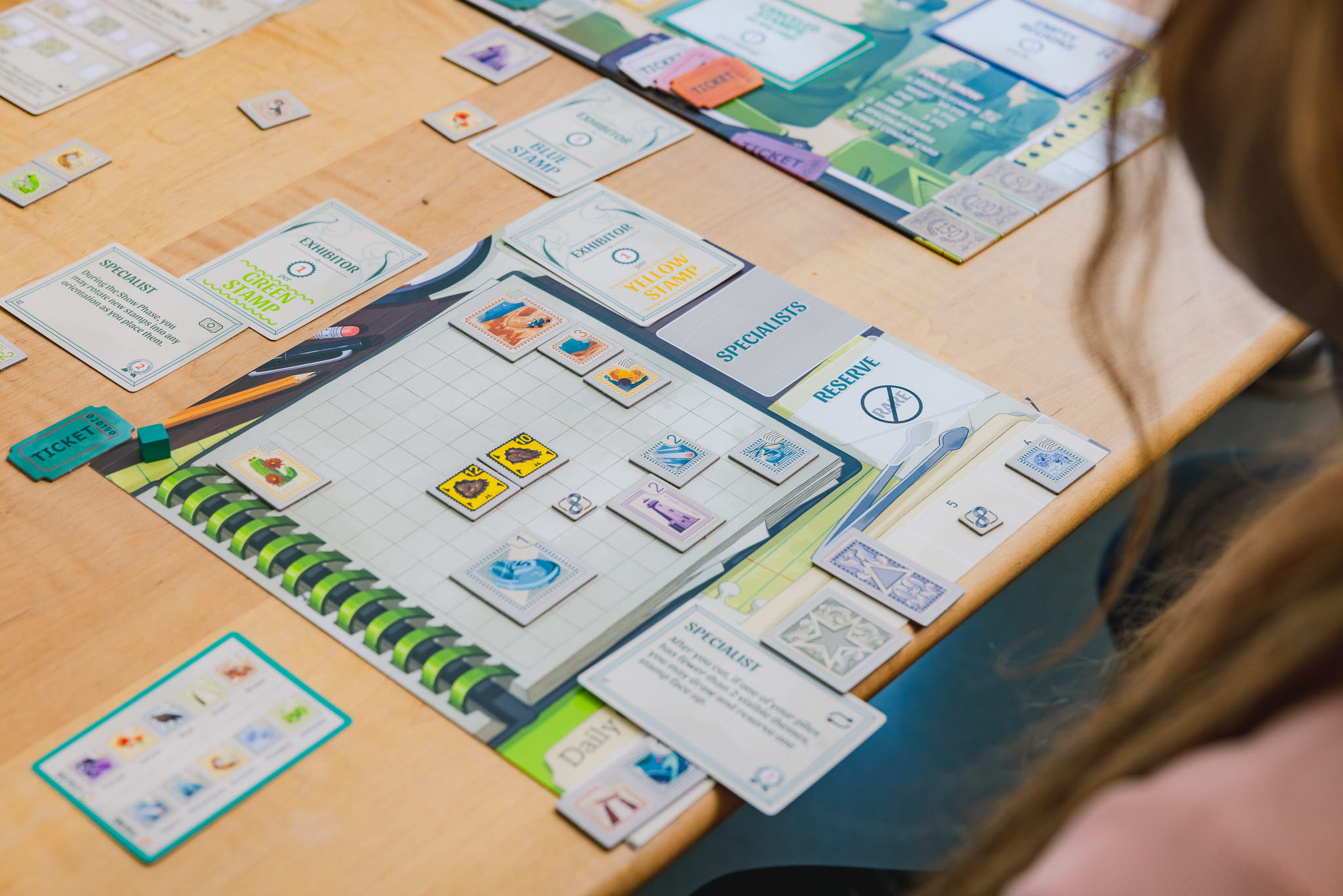 The art of stamp collecting is not just in accumulating many stamps, but in collecting high-quality stamps (including rare gold-foil stamps). This 3-round game for 1-5 players is your chance to meet other attendees, put together a beautiful and well-focused stamp collection, and show it off in a series of contests. Do well and you may walk away with the top prize at this year’s Stamp Swap!
