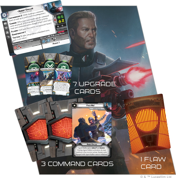 While these features project Kallus' status as a relentless ISB agent, his unit card clearly outlines all of his abilities and his three signature command cards reflect his capacity to shape your strategy. Despite all of his skills, Kallus is still susceptible to sympathizing with his enemies, a weakness that is reflected in Flaw card included with this expansion. Finally, Agent Kallus carefully calculates what he'll need for each battle and seven upgrade cards invite you to choose the gear and training that best fits your battle plan.