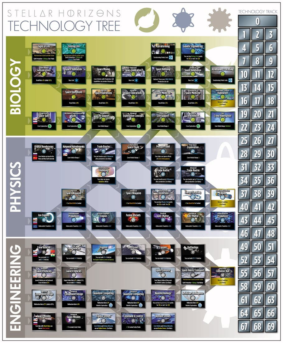Stellar Horizons includes short co-operative and competitive scenarios lasting an hour or more, and campaigns lasting a day up to about a full weekend for experienced players. Up to seven players can play at a time and the game is most fun with at least two, but there are also one-player scenarios, and the campaigns are highly suited for solo play. There are three ways to win the campaign: be the first to develop an Interstellar Colonizer, terraform a world, or achieve dominance in space over your rivals.