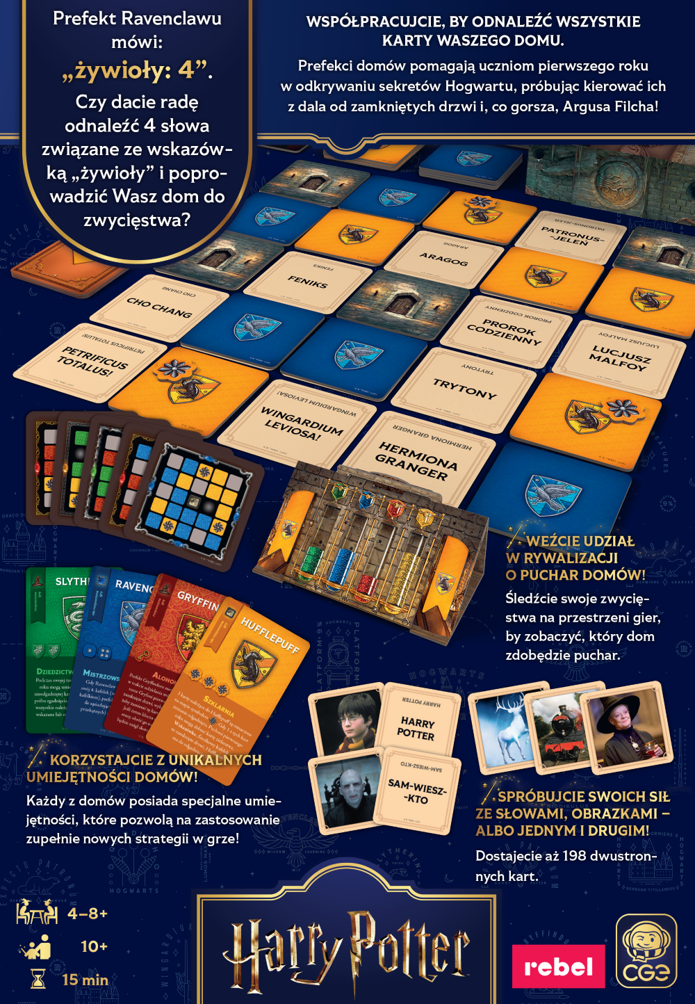 - Oprócz klasycznej rozgrywki w Tajniaków na fanów Harry’ego Pottera czeka wiele smaczków. Gdy już opanujemy zasady, możemy wprowadzić umiejętności poszczególnych domów, które pozwolą na wypróbowanie zupełnie nowych strategii. A jeśli często gramy w podobnym składzie, możemy przeprowadzić Puchar Domów – śledzenie wyników na przestrzeni kolejnych gier pozwoli wyłonić jego zwycięzcę.