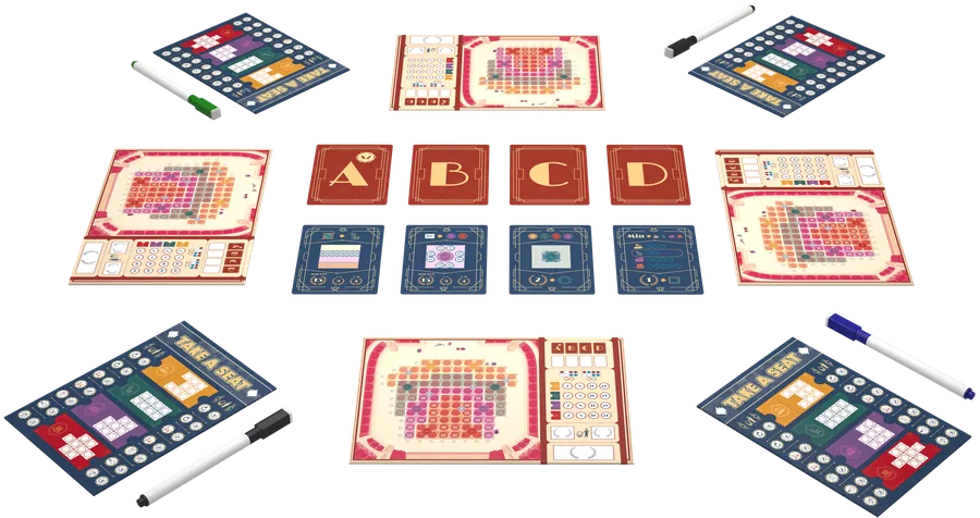 Take a Seat introduces an innovative mechanic named Share & Write where the randomness is created by player interaction (instead of a dice or a card). In each turn players will get a reservation panel and they will have to decide whether to use the usher's ability or get direct points. Then they will need to mark a reservation in the board of their right or left (depending the turn) by scratching on any of the 4 tickets of the reservation panel. Finally they will have to assign seats on the theater by marking the outline and the circles that correspond to the selected pieces in the previous step.