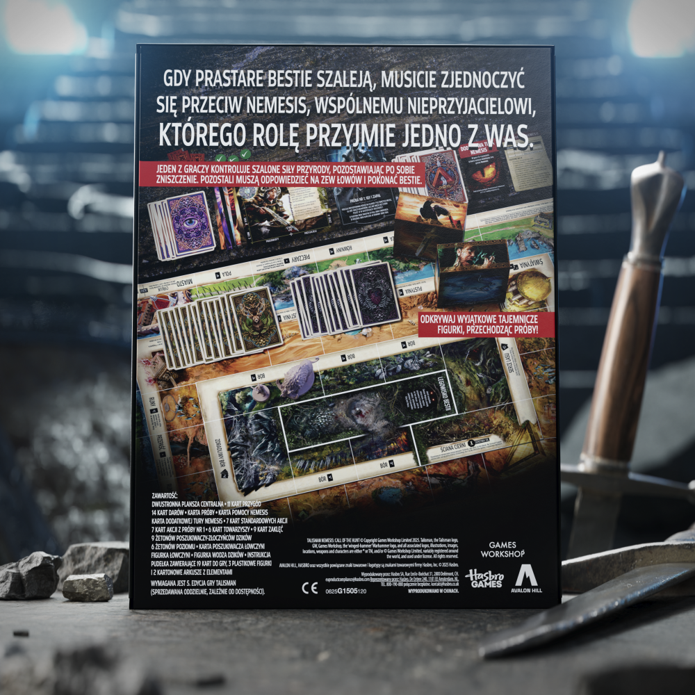 Nemesis dowodzi rozwścieczonymi bestiami, które zostawiają po sobie ścieżkę zniszczenia, a bohaterowie muszą odpowiedzieć na wezwanie polowania i powstrzymać te bestie! Przygotuj się na asymetryczną rozgrywkę 1-na-wielu (mechanika 1-vs-many) w dodatku Talisman: Magia i Miecz - Nemesis - Zew łowów!