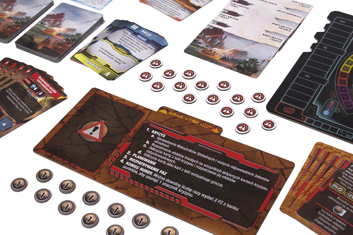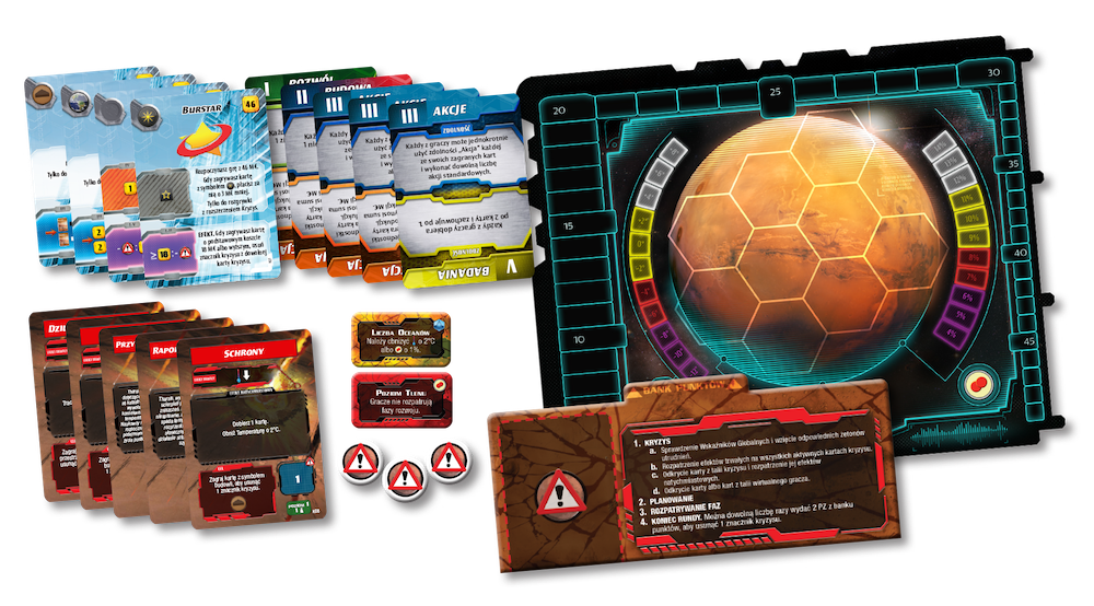 Terraformacja Marsa: Ekspedycja Ares - Kryzys to kooperacyjne rozszerzenie oferujące graczom zupełnie nowe wyzwania, którym możecie stawić czoła w pojedynkę lub w większym gronie. Mars jest już sterraformowany, ale katastrofalne w skutkach uderzenie asteroidy zniszczyło niemal całą infrastrukturę planety, w dodatku spada temperatura, zmniejsza się poziom tlenu i zamarzają oceany. Przedstawiciele korporacji muszą działać wspólnie, by doprowadzić do sytuacji, w której życie na Marsie znów będzie możliwe. Co rundę będziecie odkrywać nową kartę kryzysu. Aby ją odrzucić, musicie zrealizować określony cel.