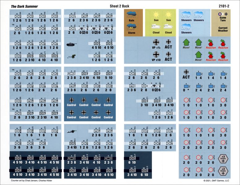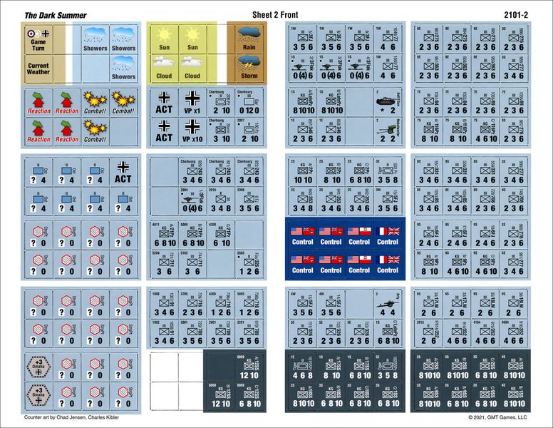 The availability of Action Round chits (for the Germans, and separately for the British and US forces) is itself determined by the draw of Weather chits, one per turn, which reflect the importance of weather on the effectiveness of Allied air superiority and Allied shipping across the Channel. Weather also determines the number of German Reaction markers, which allow limited response to Allied actions. The "Dark" chit pull system makes The Dark Summer an excellent game for solo play, while keeping both players involved in face-to-face play.