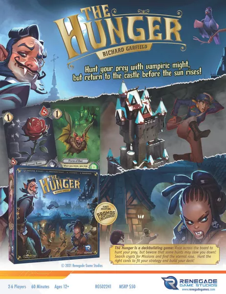 The Hunger is a race in which each vampiric player must optimize their card deck, hunt humans to gain victory points, fulfill secret missions, and eventually acquire a rose and return to the castle before sunrise. The more you hunt, the slower both you and your deck become, which will make it harder and harder to get back before daybreak. Can you become the most notorious vampire without burning to ashes at sunrise?