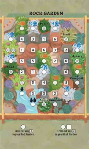 The Three Sisters Rock Garden expansion is an additional scorepad that can be used with Three Sisters. The gameplay is simple, each time you draft a die in Three Sisters, you cross off one space matching the die value and whenever you complete a row or column with crossed off spaces, you choose an adjacent bonus that is used on your main sheets. The Rock Garden is a 3"x5" score pad with 50 double-sided pages.