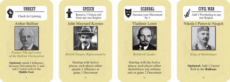 Versailles 1919, created by designers Mark Herman and Geoff Engelstein, allows you to experience this piece of history as one of the four leaders with a national agenda that must be satisfied. As one of the Big Four, you sit in a conference room gaining influence on the issues present in the room. Hovering in the waiting room sit other issues and personages who are waiting their turn to make their case to meet regional aspirations such as self-determination. Will you support Ho Chi Minh's attempt to free Vietnam from French colonialism? Help Prince Feisal establish a new nation in Mesopotamia or Chaim Weitzman create a Zionist state? Work with TE Lawrence to reduce unrest in the Middle East or with Ataturk in Anatolia?