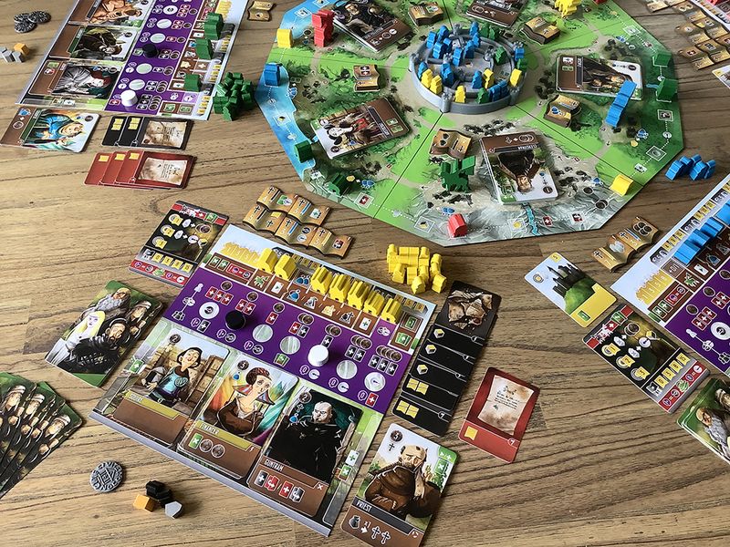 W weekend udało mi się odebrać i ograć mój egzemplarz Wicehrabiów. Po Architektach i Paladynach (posiadam obydwie gry w kolekcji, Paladyni to jedna z moich ulubionych gier) miałem bardzo duże oczekiwania. Od razu po powrocie do domu zabrałem się za studiowanie instrukcji. Jakoś opornie mi szło wpajanie zasad rozgrywki, więc stwierdziłem, że najpierw oglądnę tłumaczenie na YouTube (polecam filmik GeekFactor). Zasady spokojnie można wytłumaczyć ogranej osobie w 10/15 minut, szczególnie jeśli grała we wcześniejsze gry z serii. Wykonanie sprawiło raczej dobre wrażenie, chociaż mam kilka zastrzeżeń. Boli brak wizerunku postaci na boku pudełka oraz cienkie i śliskie planszetki graczy (podobna jakość jak w Architektach) - myślę, że do pudełka spokojnie zmieściłyby się tekturowe (takie jak w Paladynach). Symbole kierunków poruszania się po planszy w mojej opinii mogłyby być trochę bardziej widoczne. Nie do końca przemawia do mnie błyszczące wykończenie kafli planszy. Jakość kart jest taka sama lub bardzo podobna do wcześniej wymienionych gier. Znajdziemy tutaj wiele grafik i symboli znanych z serii "Zachodnich Królestw". Za sprawą kształtu planszy i zamku w centralnym punkcie gra raczej przyciąga wzrok. Setup to raczej nic nadzwyczajnego. Przed pierwszą rozgrywką należy wcisnąć tekturowe elementy w odpowiednie miejsca plastikowego zamku. W moim egzemplarzu tektura nie spasowała się idealnie i wypada w trakcie składania/rozkładania gry, ale w trakcie nie ma to żadnego znaczenia). Należy zwrócić uwagę na strony kafli planszy (w zależności od liczby graczy gramy na różnych stronach). Myślę, że w 5 minut spokojnie da się całość rozłożyć. Na początku jak zobaczyłem z ilu faz składa się pojedyncza tura gracza to trochę zwątpiłem bo spodziewałem się dużego downtime (czyli czegoś, czego w grach najbardziej nie cierpię), jednak w praktyce okazało się, że gra przebiega dość sprawnie :D Symbole są spójne ze wcześniejszymi grami z serii więc gra się łatwo i intuicyjnie. Wszystkie partie grałem w składzie dwuosobowym i na ten moment mam wrażenie, że to gra dla max. 3 graczy. Średni czas gry w 2 osobowym składzie to 1h. Rozgrywka w pełnym składzie byłaby zbyt długa i chaotyczna, ale np. walka o zamek może być dużo ciekawsza. Jak na sucharka to mamy tutaj dość dużo interakcji - walka o wpływy na zamku, możliwość zamiany kolejności kart, gdy na naszym polu zatrzyma się Wicehrabia przeciwnika, rozpatrywanie zderzenia znacznika korupcji i cnoty przez wszystkich graczy (nie ma znaczenia, u którego z graczy to wystąpiło) i standardowa walka o dostępne bonusy. Każdą grę starałem się zagrać trochę inaczej. Zdarzało mi się koncentrować na budynkach/manuskryptach/umieszczaniu mieszczan na zamku, ale grałem też bardziej zbalansowane partie. Na ten moment wydaje mi się, że można wygrać dowolnym sposobem (bardzo na +). Jak ktoś wcześniej zauważył, w Wicehrabiach dość trudno gra się na złoczyńców - trzeba sobie to tak zaplanować, żeby maksymalnie wykorzystać ich potencjał. W pierwszej partii bardzo szybko zgarnęliśmy wszystkie lenna i byliśmy zaskoczeni nagłym końcem rozgrywki :D Analizując moje wyniki, dochodzę do oczywistego wniosku, że im dłużej trwa gra, tym lepsze wyniki. Grę można przedłużać poprzez odpowiednie balansowe znacznikami korupcji i cnoty (równowaga), a najlepiej poprzez unikanie akcji powodujących ich poruszanie :D Kiedyś muszę zagrać z założeniem unikania poruszania tych znaczników za wszelką cenę - myślę, że wyniki będą wynosić 200+ punktów :D Na ten moment nasz najlepszy wynik to niecałe 100 punktów (bardzo się blokujemy :D). No fajnie się w to gra :D Nie ma za bardzo jak porównywać tej gry do Architektów i Paladynów bo jest zupełnie inna. Raczej nie jest to gra rodzinna (chyba że dla ogranych rodzin), ale palenia zwojów też się nie spodziewajcie. Trochę mi się kojarzy z GWT (pewnie przez łażenie po planszy). Z każdą partią gra zyskuje u mnie coraz większe uznanie. Paladynów z piedestału nie strąci, ale na pewno zasługuje na uznanie. W rozsądnej cenie dostajemy wypakowane pudełko z kompletną grą, która ma ciekawe mechaniki, jest bardzo regrywalna i którą można rozegrać w akceptowalnym czasie.