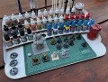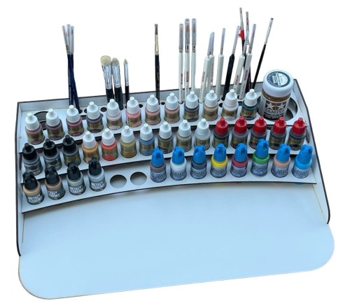 Prezentujemy warsztat modelarski, który pomieści 41 buteleczek z farbą w rozmiarze Vallejo/Army Painter/Scale75 oraz conajmniej 24 pędzle. Jest też miejsce na nożyki modelarskie oraz inne narzędzia w tym kubek z wodą.