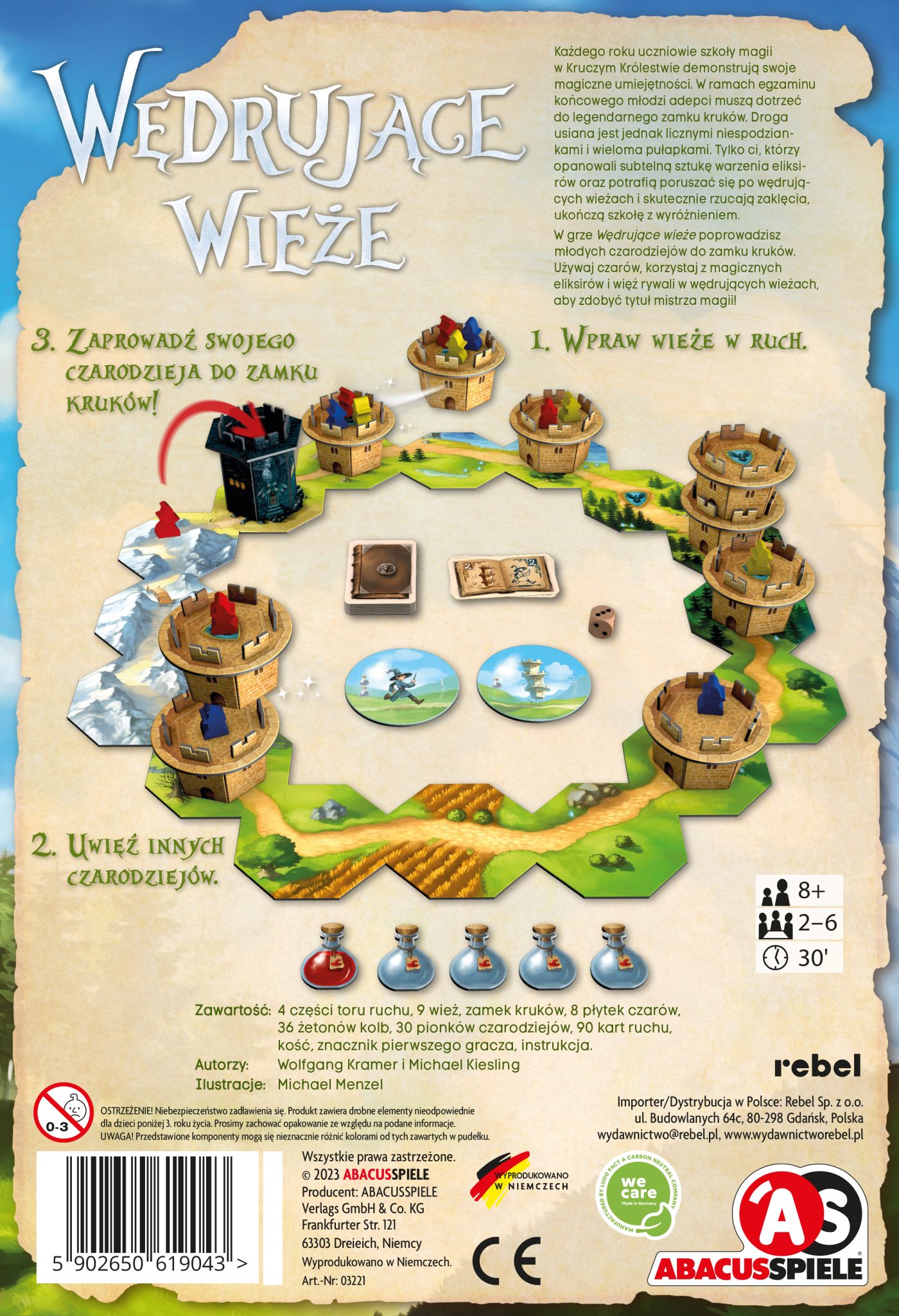 W grze Wędrujące wieże poprowadzisz młodych czarodziejów do zamku kruków. Magowie mogą się poruszać pieszo albo za pomocą wędrujących wież. Gdy gracz uwięzi innego czarodzieja w wieży, jego kolba w magiczny sposób napełnia się eliksirem. Zwycięży ten, kto sprytnie wykorzysta nadarzające się okazje i jako pierwszy umieści wszystkich swoich czarodziejów w zamku.