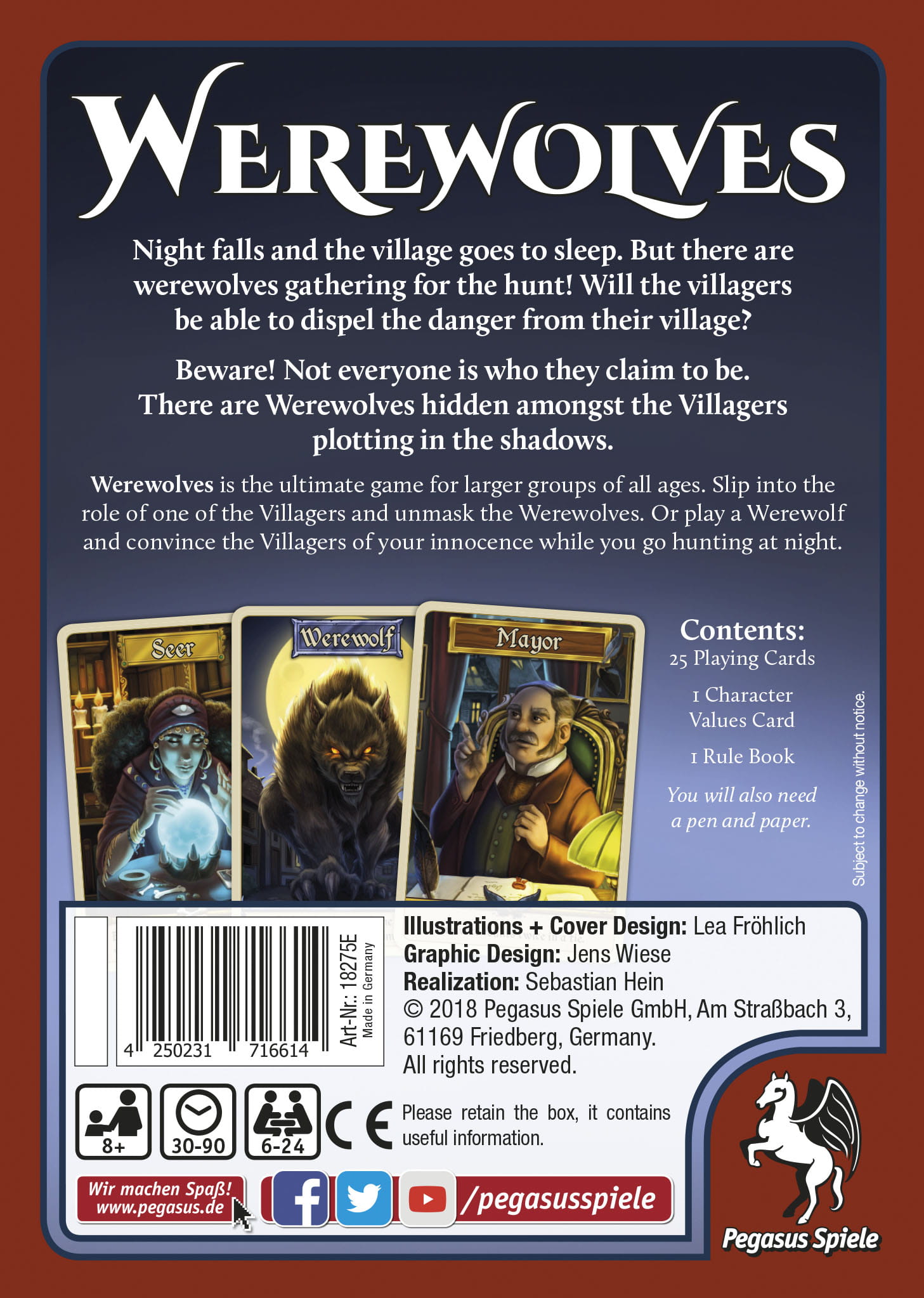 Night falls and the village goes to sleep. But there are Were- wolves among the villagers that seek out and eat 1 victim each night. Will the Villagers be able to discover who the Werewolves are and free themselves from their threat?