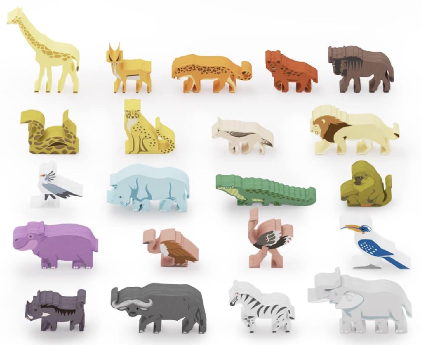 Zestaw 21 drewnianych znaczników zwierząt do gry Wild Serengeti. Zestaw zawiera: