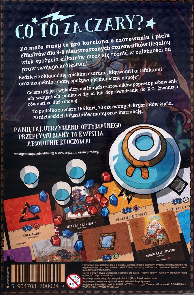 Za mało many to gra karciana o czarowaniu i piciu eliksirów dla 3-6 nieustraszonych czarowników (legalny wiek spożycia eliksirów może się różnić w zależności od praw Twojego królestwa). Będziecie się nawzajem okładać za pomocą epickich zaklęć, klątw i artefaktów, jednocześnie uzupełniając swoją manę, pijąc magiczne mikstury*.