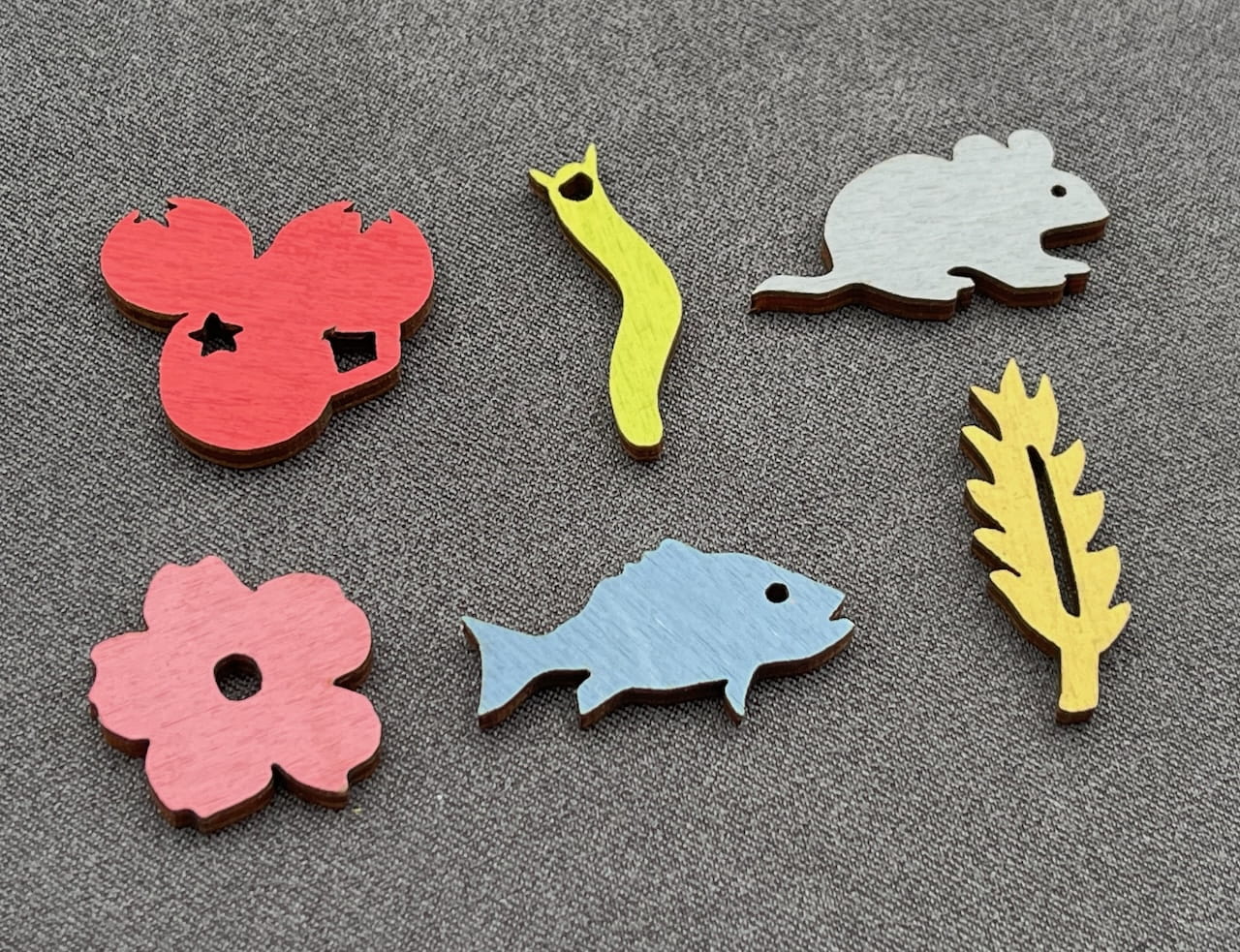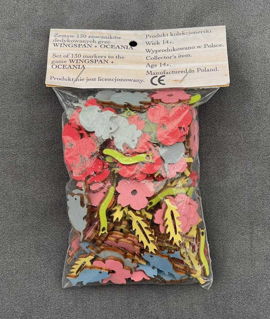 Zestaw 130 znaczników do gry Na Skrzydłach (Wingspan) wyprodukowany ze sklejki brzozowej 3mm, pokrytej farbami dekoracyjnymi. Zestaw zawiera znaczniki zarówno do gry podstawowej jak i dodatku Oceania.